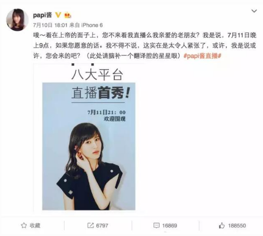 7月10日,Papi醬公布了自己即將第一次做直播的消息,這令我不禁十分的期待,該來的終于來了。