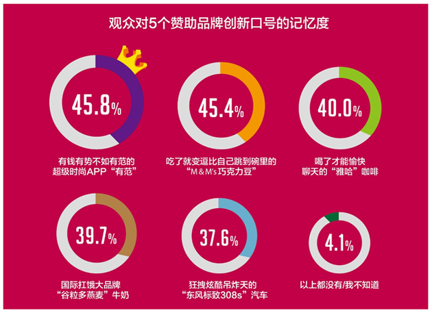 第一季的 喝了能活到99的莫斯利安酸奶,第二季的 有錢有勢不如有范的超級時尚APP‘有范’”、“吃了就變逗比自己跳到碗里的M&M’s巧克力豆 國際抗餓大品牌 谷粒多燕麥牛奶等等,都獲得了較高的品牌回想度。