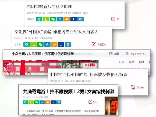 你看,《空姐做外圍女被騙,嫌犯既當(dāng)介紹人又當(dāng)客人》顯然是人民群眾真正喜聞樂(lè)見(jiàn)的新聞,像《中烏合研八大殺手锏,俄不滿讓俄沒(méi)錢(qián)賺》則是廣大愛(ài)國(guó)青年最喜聞樂(lè)見(jiàn)的,還有《中國(guó)富二代英國(guó)醉駕,超跑被沒(méi)收仍無(wú)悔意》必然是能調(diào)動(dòng)廣大人民情緒的好新聞,《電閃雷鳴背后的科學(xué)原理》的評(píng)論數(shù)只有兩條,你當(dāng)然不用奇怪,它與《共洗鴛鴦浴!拍不雅視頻,2男1女賓館找刺激》相比,當(dāng)然更難調(diào)動(dòng)大家的閱讀興趣。