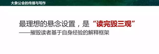 我們自己分析過(guò)自己的文本,有較高傳播率的文章,從結(jié)構(gòu)上,基本上都符合懸念設(shè)置、陳述解析、懸念設(shè)置、陳述解析不斷循環(huán)的規(guī)律。文本上,懸念可以是直截了當(dāng)?shù)卦O(shè)問(wèn),也可以不露痕跡地鋪陳事實(shí)或現(xiàn)象甚至直接下判斷來(lái)自動(dòng)設(shè)置。