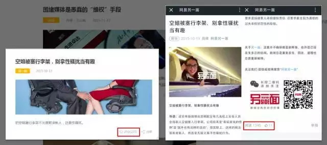回過(guò)頭,那些既嚴(yán)肅而且受歡迎的內(nèi)容呢?比如前面講的網(wǎng)易另一面,我們對(duì)比一下數(shù)據(jù),他們深耕了許多年,有非常好的品牌,在微信上也開(kāi)了很長(zhǎng)時(shí)間,但是你可以看到,一模一樣的標(biāo)題和內(nèi)容,在微信上的閱讀數(shù)少的可憐,閱讀數(shù)竟然只和在門(mén)戶上的評(píng)論數(shù)相當(dāng)。