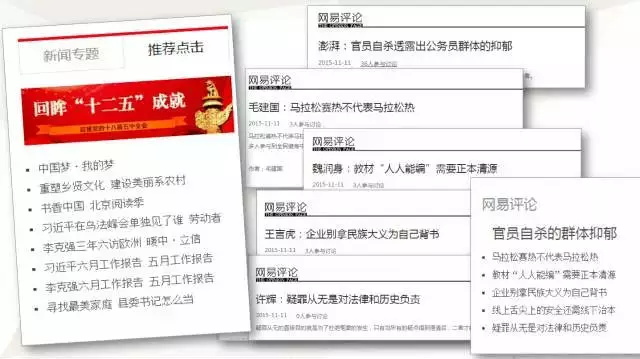 這是門(mén)戶網(wǎng)站推薦的內(nèi)容,打頭的是中國(guó)夢(mèng)我的夢(mèng),你能猜到有多少人愿意打開(kāi)看。這部分是評(píng)論,給出的位置相當(dāng)突出,這是他們自己真正愿意推薦給讀者看的嚴(yán)肅內(nèi)容,但你看它的跟貼數(shù),甚至比電閃雷鳴背后的科學(xué)道理還低,這么好的位置,評(píng)論數(shù)說(shuō)明其實(shí)根本就是沒(méi)人看的,這和十年前已經(jīng)發(fā)生了根本差別,過(guò)去評(píng)論會(huì)有非常熱的討論。這其實(shí)也很好地反映了為什么說(shuō)我們的報(bào)紙和雜志要死亡,因?yàn)槿藗冮喿x興趣早已改變,但他們還在做沒(méi)有人看的內(nèi)容。