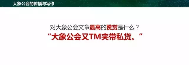 另外,它也可以成為你與讀者的形成的一種默契和期待。甚至對(duì)那些不喜歡你的人都是有效的,比如他明明知道你文章的結(jié)尾多半是他不喜歡的,但他還是要忍不住去看,看完后還不忘加一句評(píng)論:大象公會(huì)又TM販賣(mài)私貨。